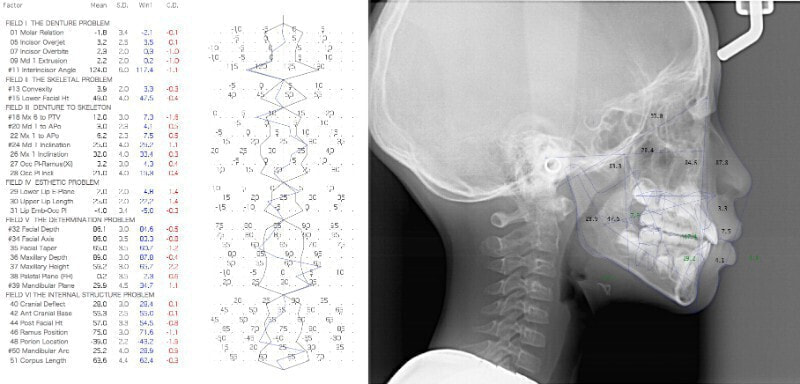 分析診断:FXフェイシャルアキシスが83度で、咬合力が極端に弱い顔面骨格ではありません。上下顎の骨格的バランスも平均値内には収まっています。Upper Molar PTV値から、上顎の奥行きが少ないとわかります。前歯の位置、E-lineと下唇の位置等から、歯が大きくて顎が小さいディスクレパンシーケースであると診断されます。