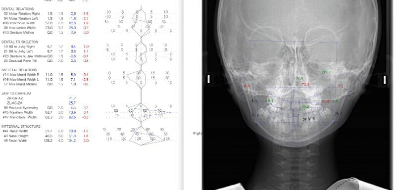 分析診断:左右の骨格的非対称が少し認められます。上顔面の幅径はさほど狭くなありませんが、下顎や下顔面の幅径は狭いと出ています。