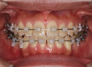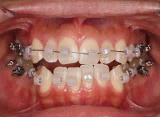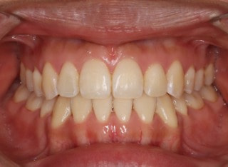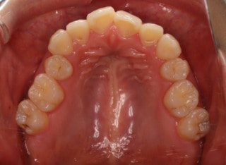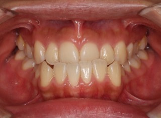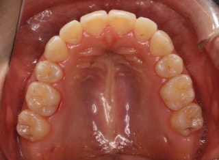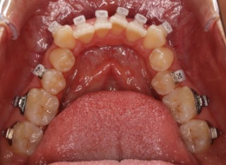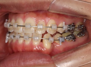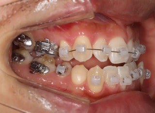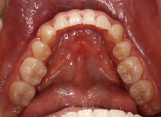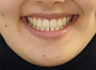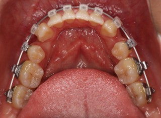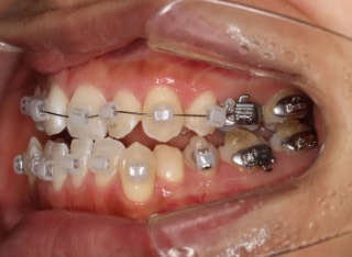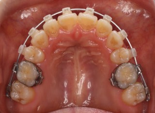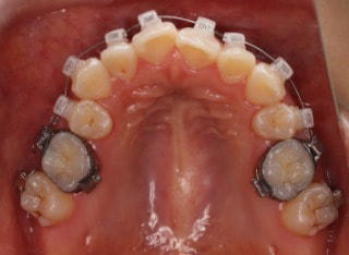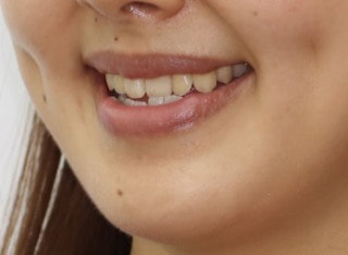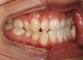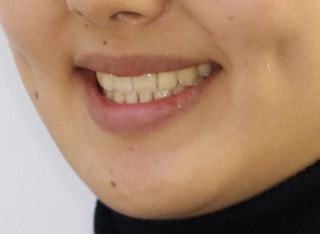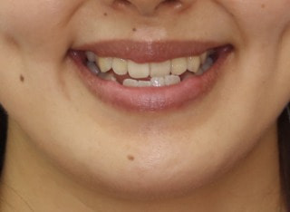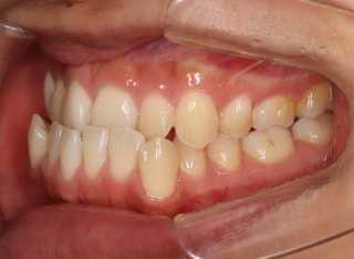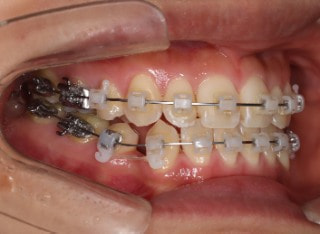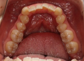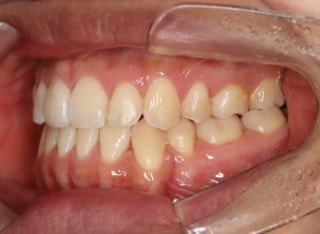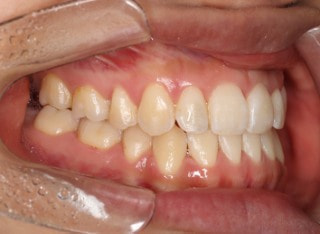 解説:反対咬合状態をまず最初に改善するために、装置装着時に咬合を持ち上げるマウントを下顎大臼歯部に築造しております。2ヶ月後には前歯のジャンプを確認しました。